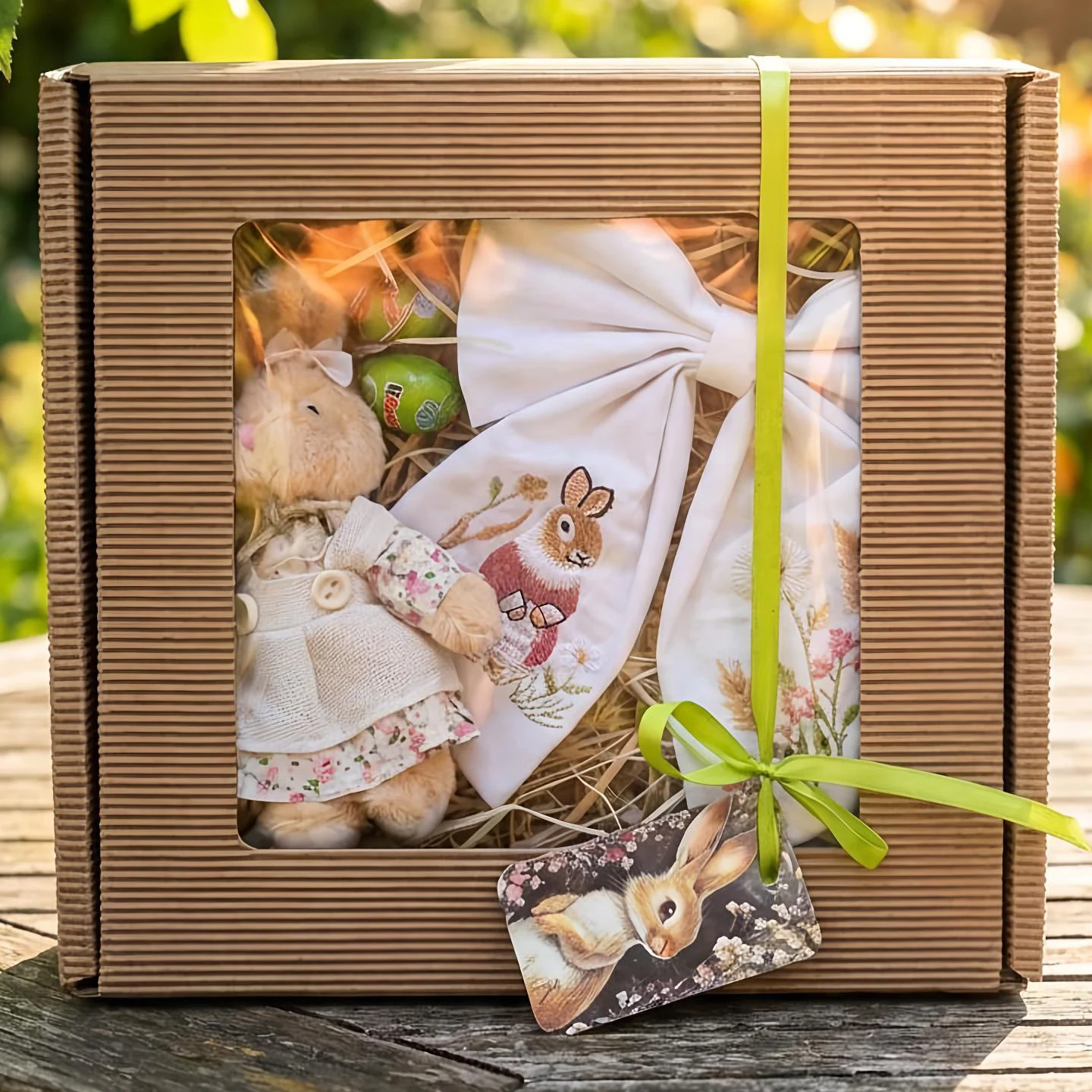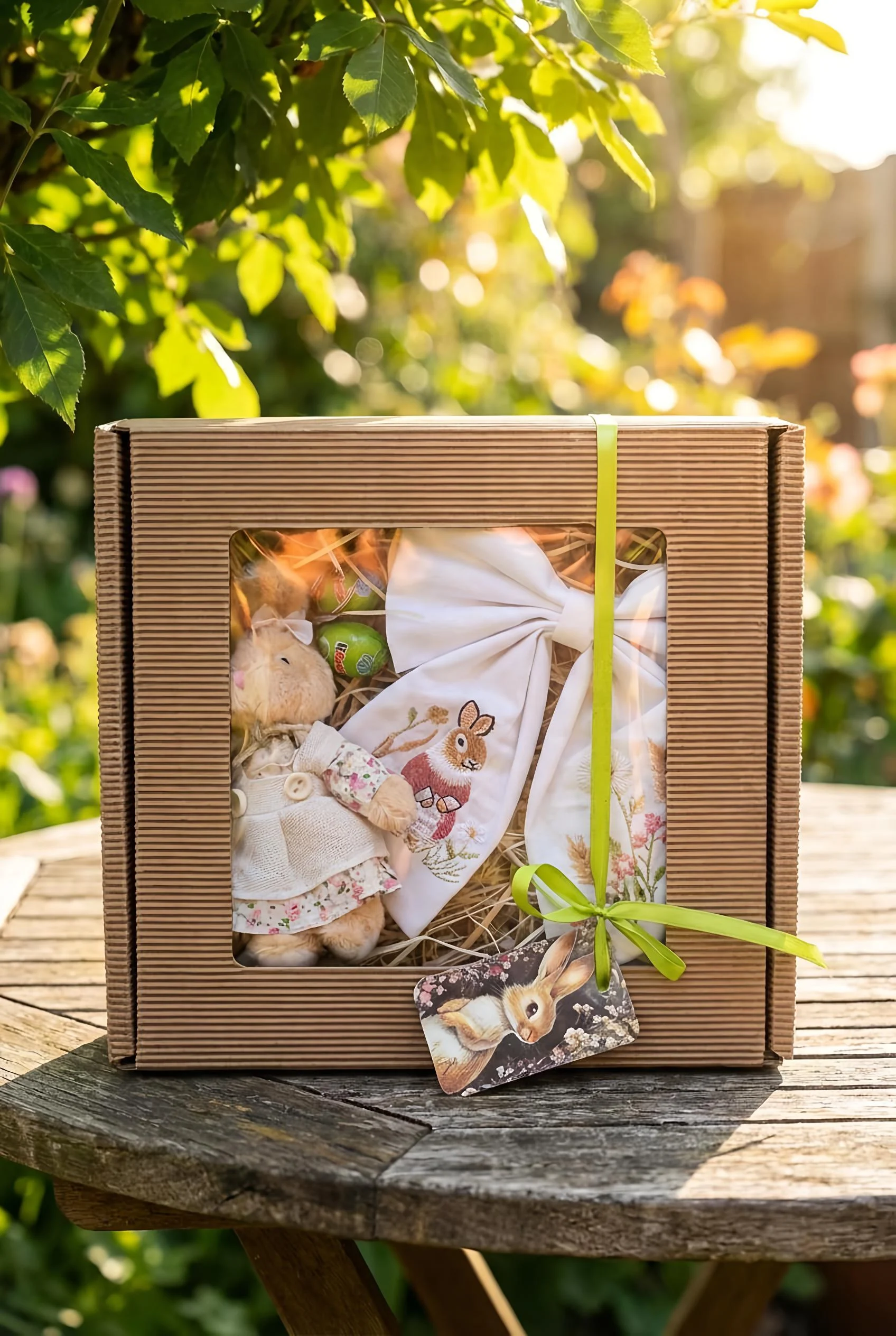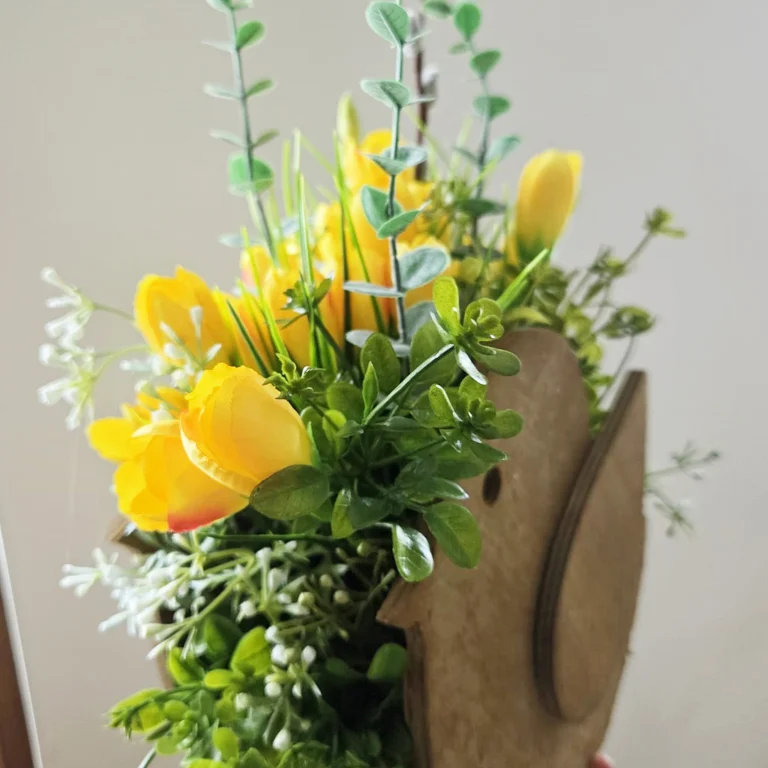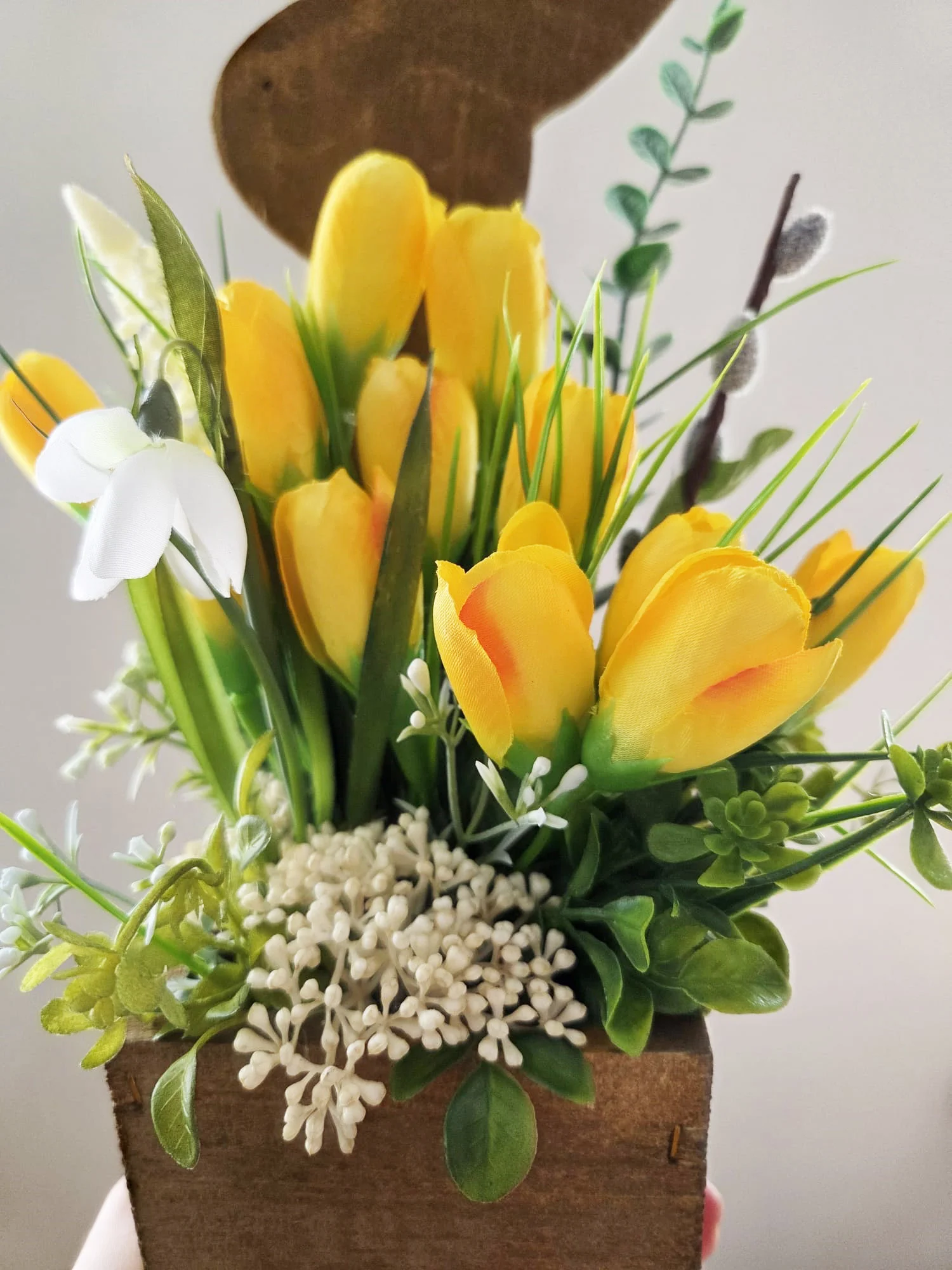 Żółte krokusy w drewnianej skrzynce z zajączkiem