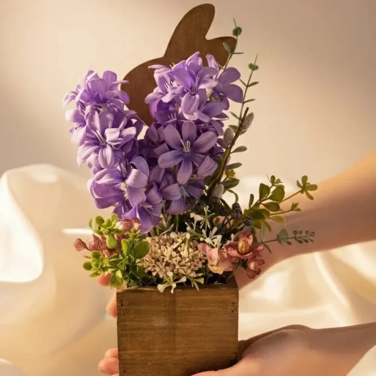 Fioletowy hiacynt w drewnianej skrzynce z zajączkiem