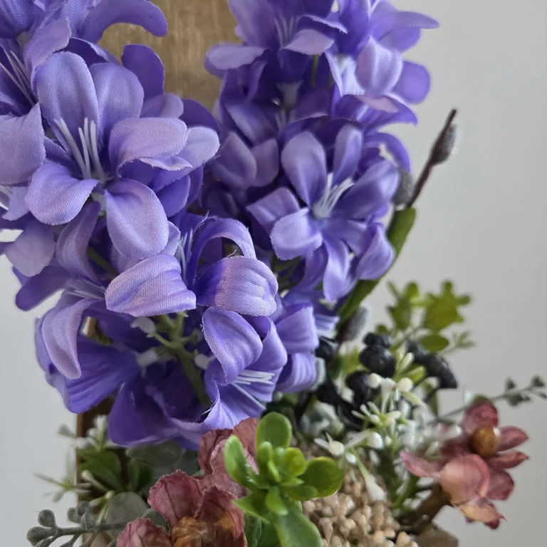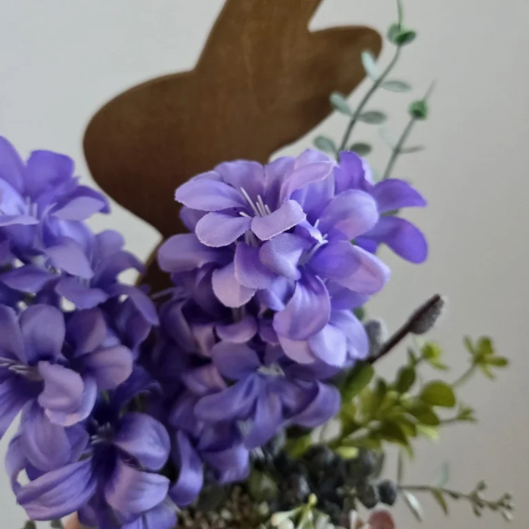 * Bogactwo wiosennych kwiatów: W kompozycji znajdziesz realistycznie hiacynty w odcieniach fioletu i pierwsze wiosenne kwiaty.