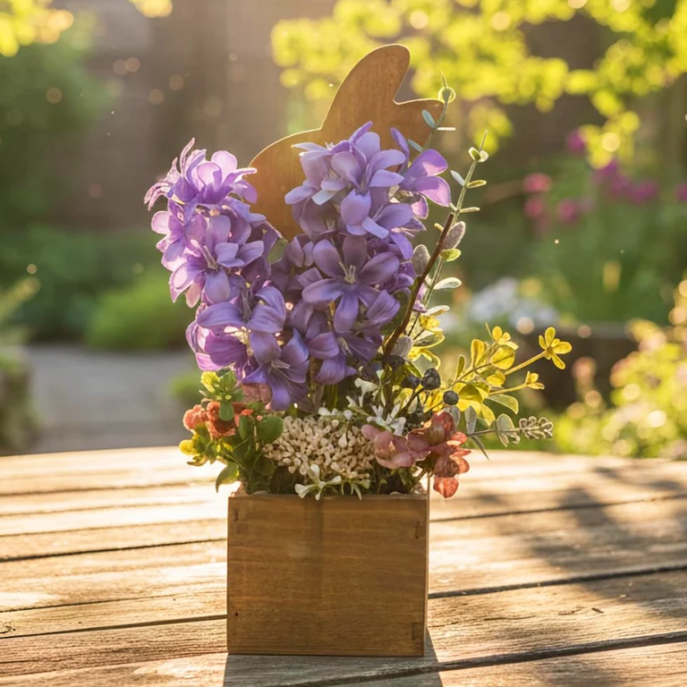 * Rustykalna podstawa: Kwiaty osadzone są w solidnej, ciemnobrązowej skrzynce z naturalnego drewna, która podkreśla ekologiczny charakter ozdoby.