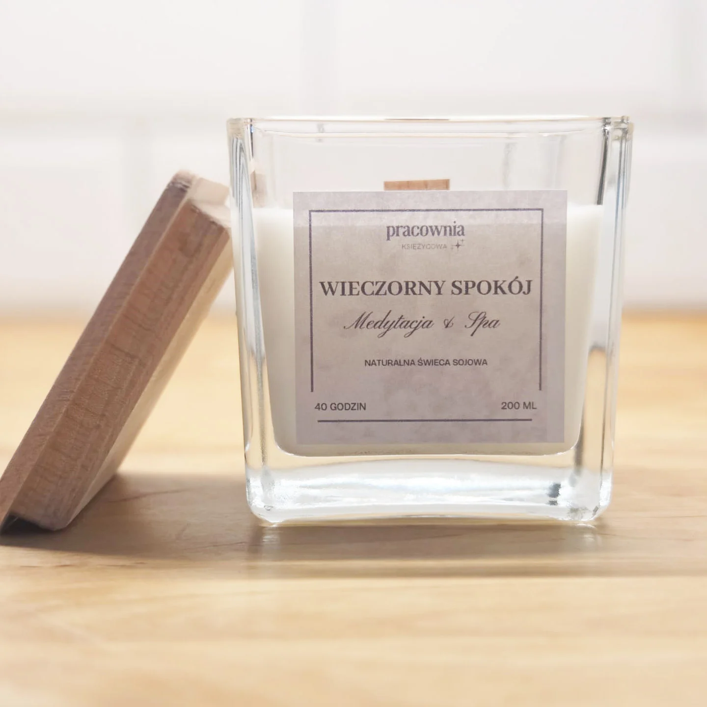 - Drewniana pokrywka, która może służyć za podkładkę w trakcie palenia świecy