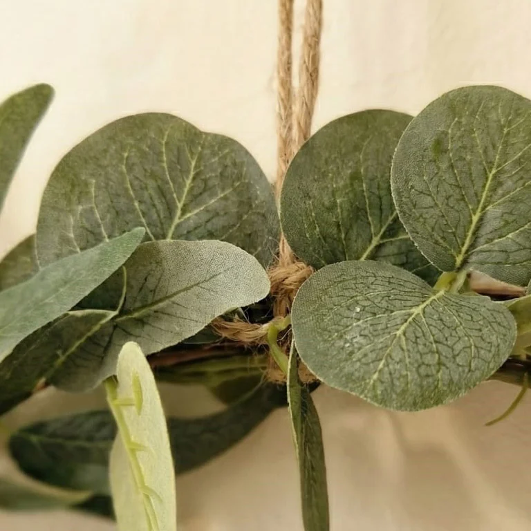Naturalne inspiracje: Wianek powstał z połączenia bujnych liści eukaliptusa, które nadają mu objętości i świeżości. Uzupełnieniem są pastelowe róże w odcieniach kremu, beżu i pudrowego różu oraz subtelne akcenty suszonych traw, tworząc spójną i harmonijną kompozycję.