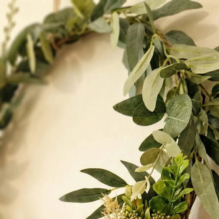 Wymiary i zastosowanie: Średnica wianka wynosi około 40 cm, co czyni go idealną ozdobą na drzwi wejściowe, ścianę w salonie, sypialni czy przedpokoju.