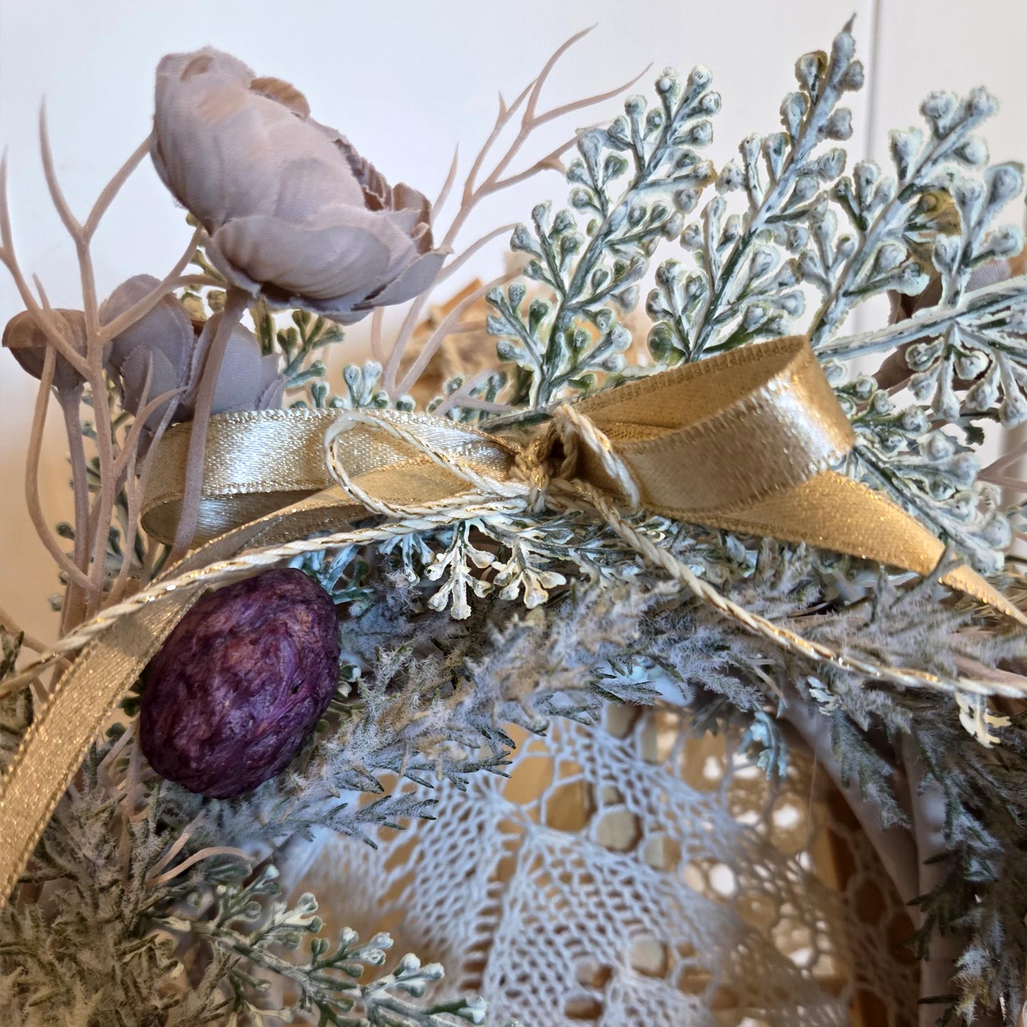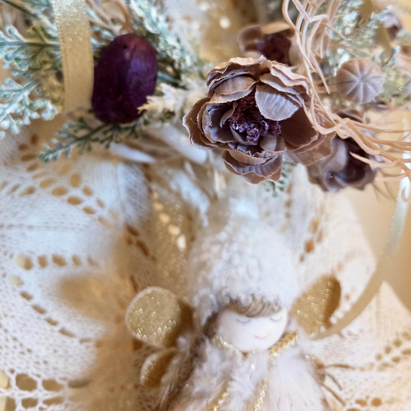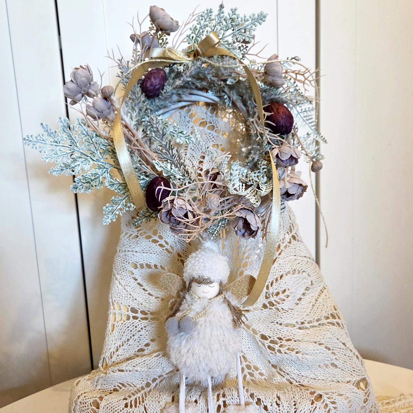 Zimowy wianek z najwyższej jakości sztucznych gałązek i dodatków. Odcienie bieli i różu. Wykończony złotą kokardą i pluszową zawieszką anioła. Gotowy do zawieszenia.