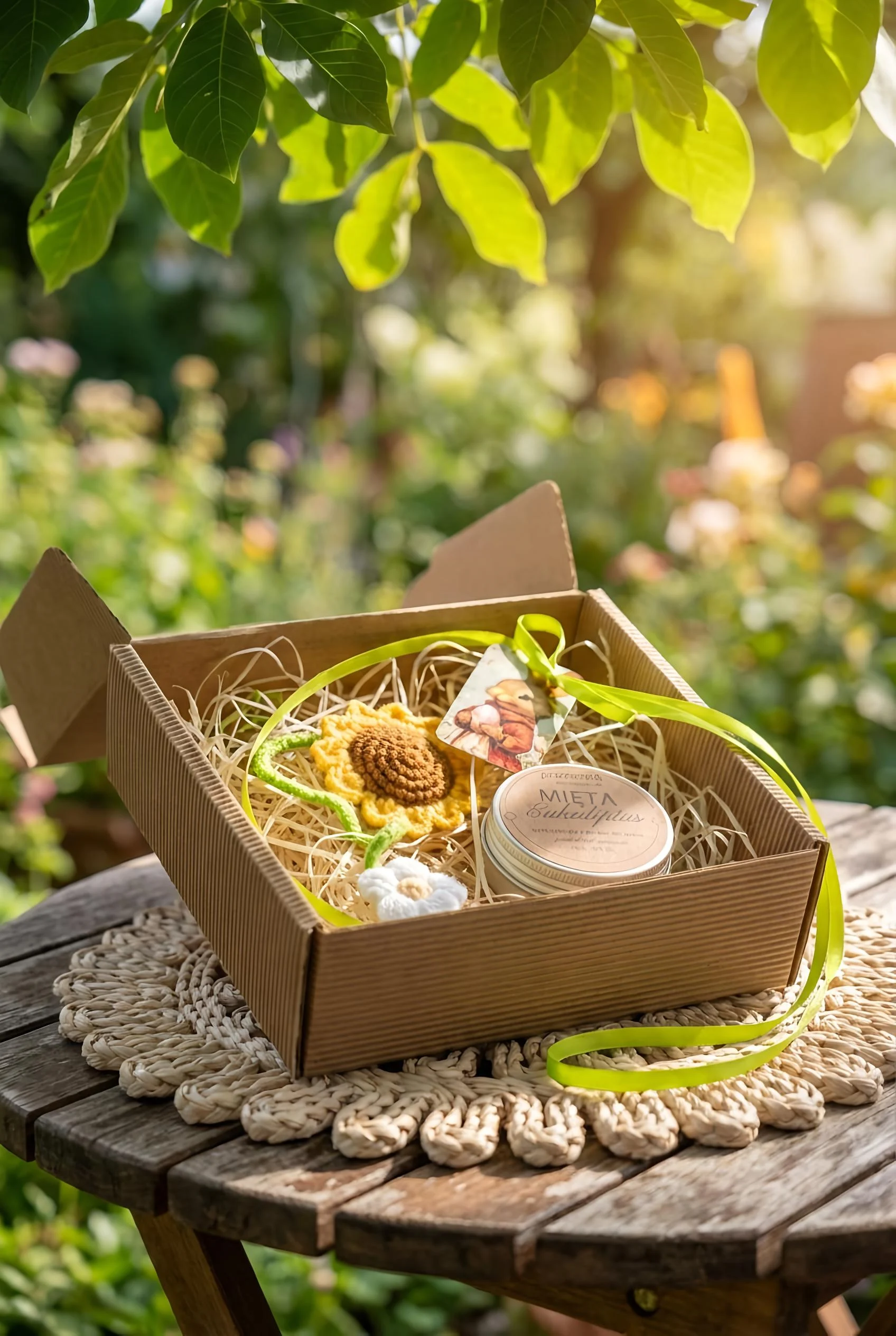 Całość zapakowana w tekturowe ryflowane pudełko i wiosenną tasiemkę z bilecikiem do uzupełnienia.