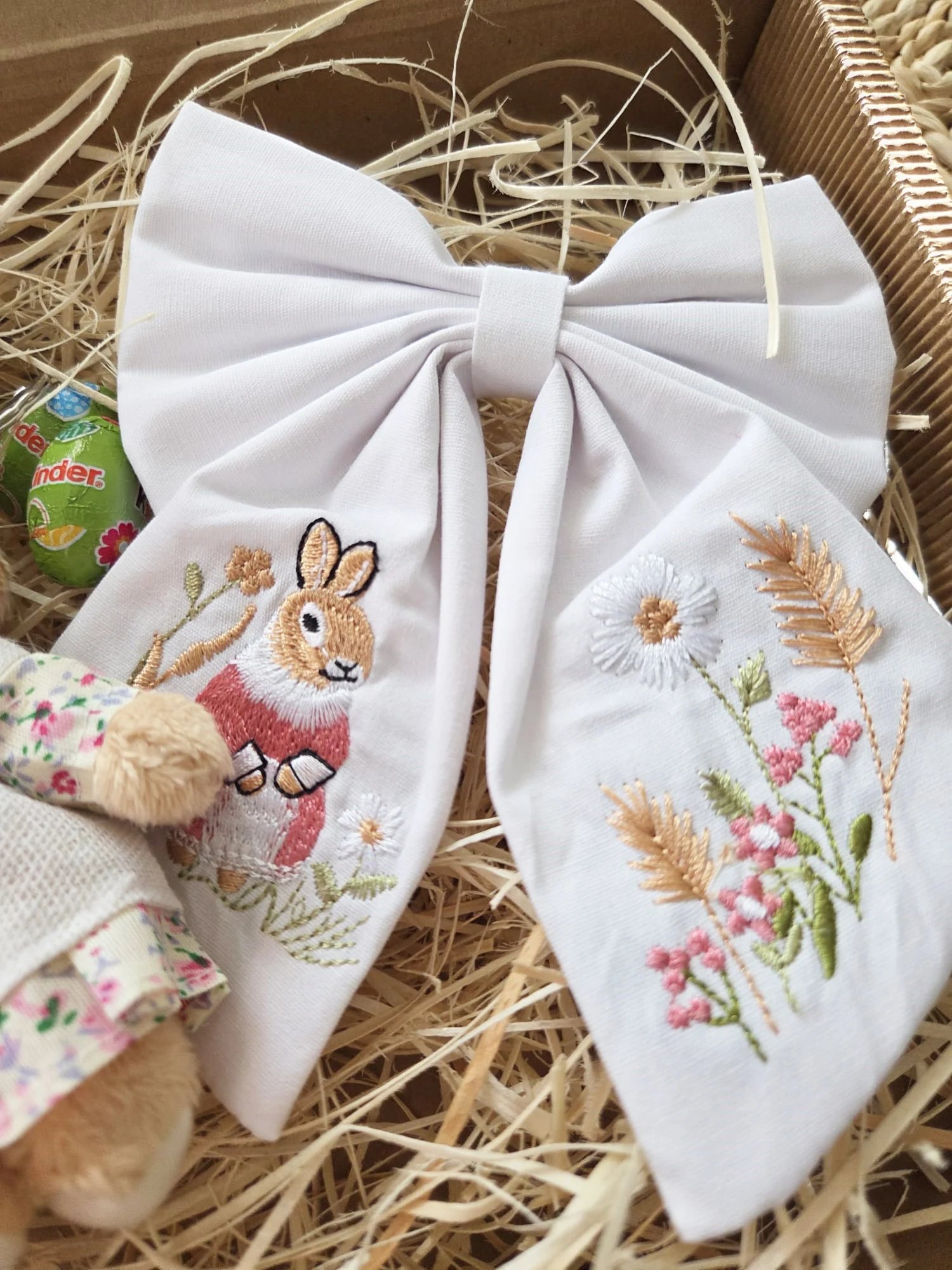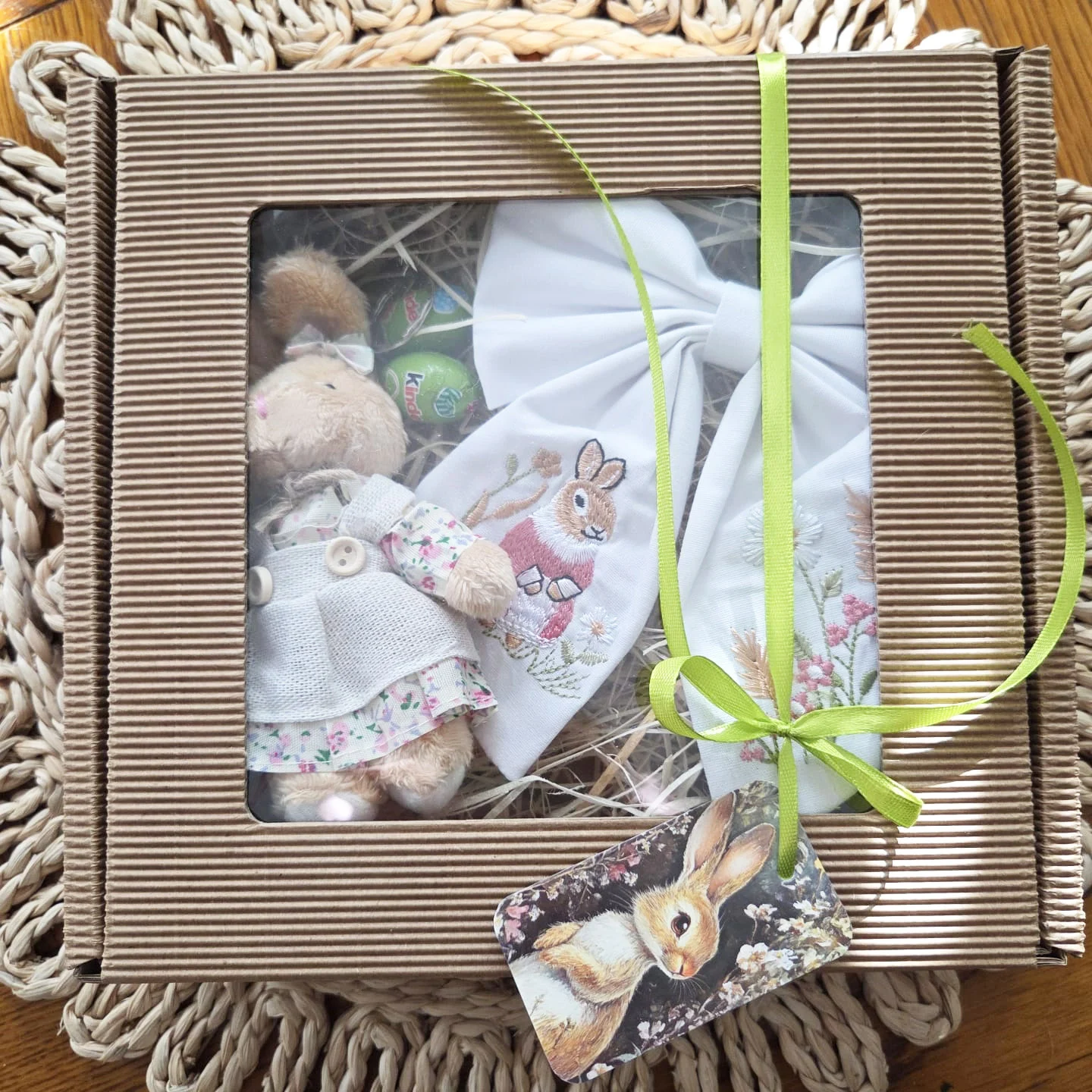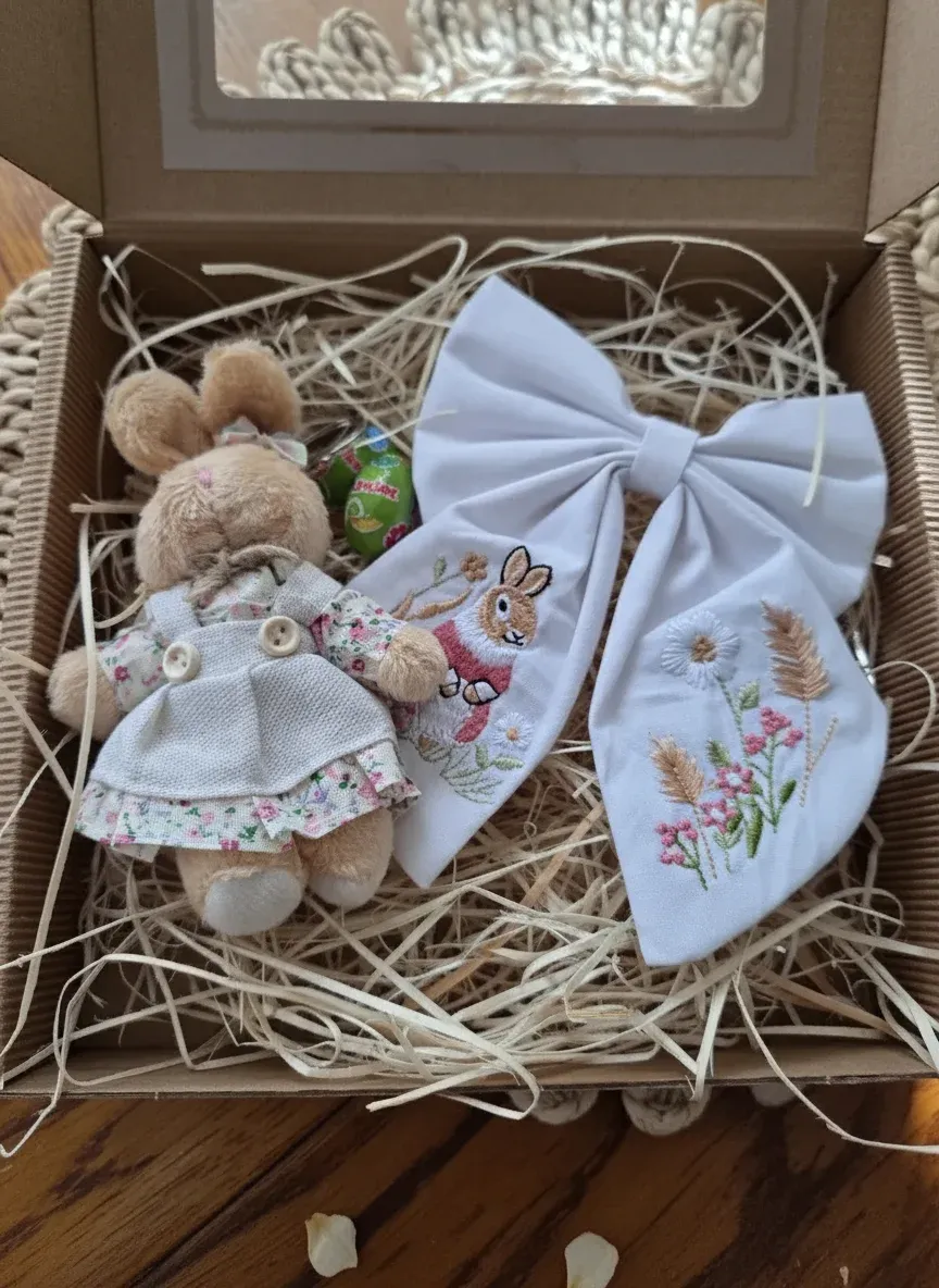 Gotowy do wręczenia zestaw prezentowy dla dziewczynki. Zawiera: pluszowy breloczek z króliczkiem, biała kokarda/ spinka do włosów, czekoladowe jajeczka.